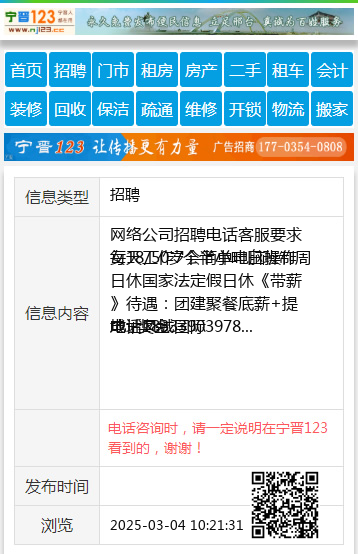 网络公司招聘电话客服要求女18/50岁会简单电脑操作 每天工作7个半小时白班制周日休国家法定假日休《带薪》待遇:团建聚餐底薪+提成+奖金 地址凤城国际 电话18333903978