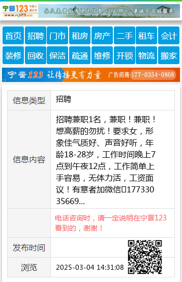 招聘兼职1名,兼职!兼职!想高薪的勿扰!要求女,形象佳气质好、声音好听,年龄18-28岁,工作时间晚上7点到午夜12点,工作简单上手容易,无体力活,工资面议!有意者加微信17733035669
