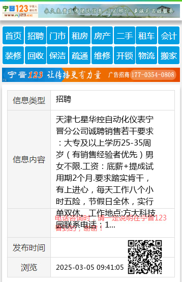 天津七星华控自动化仪表宁晋分公司诚聘销售若干要求:大专及以上学历25-35周岁(有销售经验者优先)男女不限.工资:底薪+提成试用期2个月.要求踏实肯干,有上进心,每天工作八个小时五险,节假日全休,实行单双休。工作地点:方大科技园联系电话:13752055332刘经理.17867425860罗经理 【电话咨询时,请一定说明在宁晋123看到的,谢谢!】 |