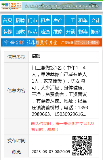 门卫兼做饭1名(中午1-4人,早晚就你自己或有他人1人,家常便饭),男女均可,人少活轻,身体健康、干净,免费食宿,工资面议,有意者从速。地址:纪昌庄镇清善桥村,电话:13932989663、15030929616 【电话咨询时,请一定说明在宁晋123看到的,谢谢!】 |