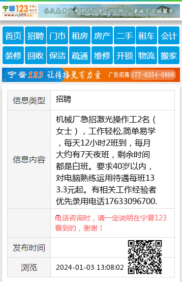 机械厂急招激光操作工2名(女士),工作轻松,简单易学,每天12小时2班到,每月大约有7天夜班,剩余时间都是白班。要求40岁以内,对电脑熟练运用待遇每班133.3元起。有相关工作经验者优先录用电话17633096700 【电话咨询时,请一定说明在宁晋123看到的,谢谢!】 |