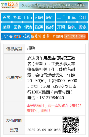 森达货车用品店招聘男工数名(长期),主要从事大车篷布等相关工作,能吃苦耐劳,会电气焊者优先,年龄20--50岁,工资4000--6000。地址:308与393交叉口南行100米路西(南曹村西)电话:15127984040 【电话咨询时,请一定说明在宁晋123看到的,谢谢!】 |
