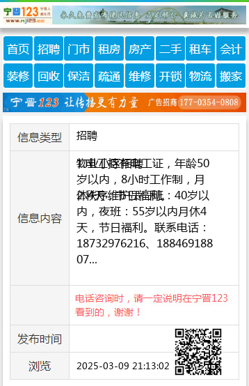 2.秩序维护员白班:40岁以内,夜班:55岁以内月休4天,节日福利。联系电话:18732976216、18846918807 【电话咨询时,请一定说明在宁晋123看到的,谢谢!】 |