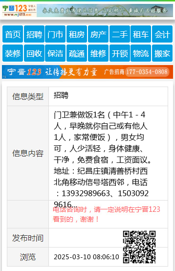 门卫兼做饭1名(中午1-4人,早晚就你自己或有他人1人,家常便饭),男女均可,人少活轻,身体健康、干净,免费食宿,工资面议。地址:纪昌庄镇清善桥村西北角移动信号塔西邻,电话:13932989663、15030929616 【电话咨询时,请一定说明在宁晋123看到的,谢谢!】 |