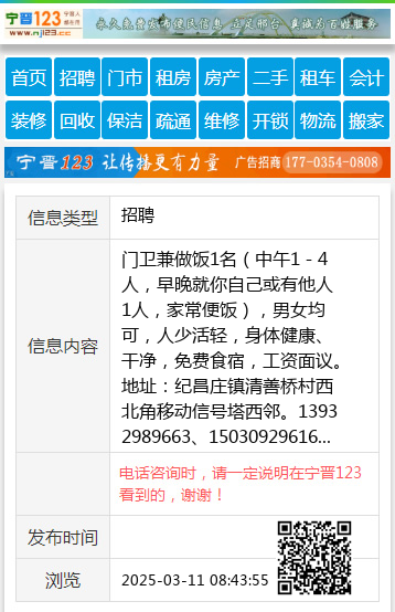 门卫兼做饭1名(中午1-4人,早晚就你自己或有他人1人,家常便饭),男女均可,人少活轻,身体健康、干净,免费食宿,工资面议。地址:纪昌庄镇清善桥村西北角移动信号塔西邻。13932989663、15030929616 【电话咨询时,请一定说明在宁晋123看到的,谢谢!】 |