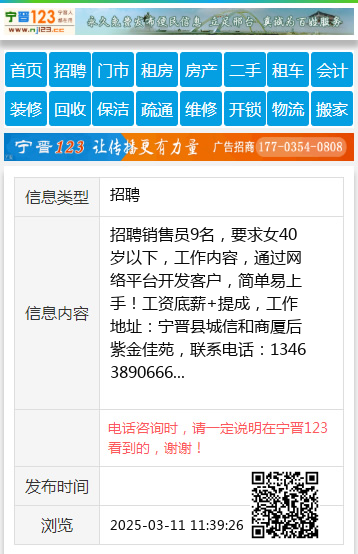 招聘销售员9名,要求女40岁以下,工作内容,通过网络平台开发客户,简单易上手!工资底薪+提成,工作地址:宁晋县城信和商厦后紫金佳苑,联系电话:13463890666 【电话咨询时,请一定说明在宁晋123看到的,谢谢!】 |