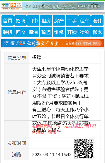 天津七星华控自动化仪表宁晋分公司诚聘销售若干要求:大专及以上学历25-35周岁(有销售经验者优先)男女不限.工资:底薪+提成试用期2个月要求踏实肯干,有上进心,每天工作八个小时五险,节假日全休实行单双休.工作地点:方大科技园联系电话:13752055332刘经理.17867425860罗经理 【电话咨询时,请一定说明在宁晋123看到的,谢谢!】 |