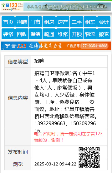 招聘门卫兼做饭1名(中午1-4人,早晚就你自己或有他人1人,家常便饭),男女均可,人少活轻,身体健康、干净,免费食宿,工资面议。地址:纪昌庄镇清善桥村西北角移动信号塔西邻。13932989663、15030929616 【电话咨询时,请一定说明在宁晋123看到的,谢谢!】 |