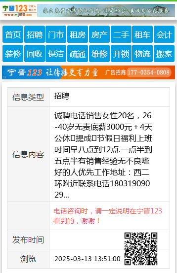 诚聘电话销售女性20名,26-40岁无责底薪3000元+4天公休➕提成➕节假日福利上班时间早八点到12点.一点半到五点半有销售经验无不良嗜好的人优先工作地址:西二环附近联系电话18031909029 【电话咨询时,请一定说明在宁晋123看到的,谢谢!】 |