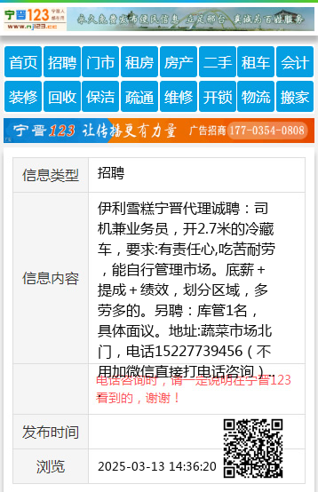 伊利雪糕宁晋代理诚聘:司机兼业务员,开2.7米的冷藏车,要求:有责任心,吃苦耐劳,能自行管理市场。底薪+提成+绩效,划分区域,多劳多的。另聘:库管1名,具体面议。地址:蔬菜市场北门,电话15227739456(不用加微信直接打电话咨询) 【电话咨询时,请一定说明在宁晋123看到的,谢谢!】 |