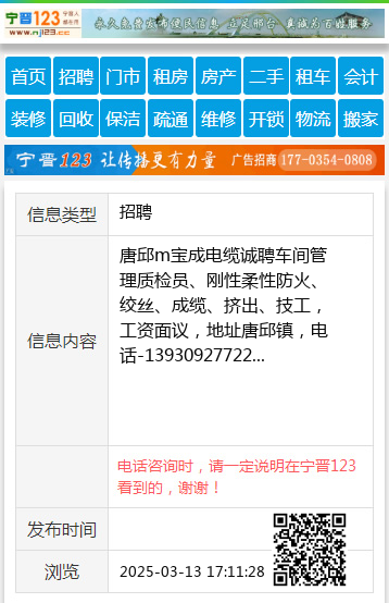 唐邱m宝成电缆诚聘车间管理质检员、刚性柔性防火、绞丝、成缆、挤出、技工,工资面议,地址唐邱镇,电话-13930927722 【电话咨询时,请一定说明在宁晋123看到的,谢谢!】 |