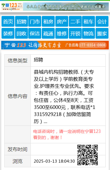 县城内机构招聘教师.(大专及以上学历)学前教育类专业.护理养生专业优先。要求:有责任心,执行力高。可包住宿,公休4至8天,工资3500至6000元,联系电话*13315929218(加微信留简历) 【电话咨询时,请一定说明在宁晋123看到的,谢谢!】 |