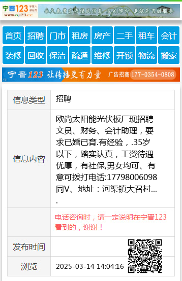 欧尚太阳能光伏板厂现招聘文员、财务、会计助理,要求已婚已育.有经验,.35岁以下,踏实认真,工资待遇优厚,有社保,男女均可、有意可拨打电话:17798006098同V、地址:河渠镇大召村. 【电话咨询时,请一定说明在宁晋123看到的,谢谢!】 |