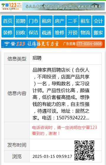 品牌家具招聘店长(合伙人,不用投资,店面产品共享)一名,导购数名,实习设计师。产品性价比高,颜值高,低价套餐高提成。想挣钱的有能力的来,自主性强,待遇可谈。地址:居然之家。电话:15075924222 【电话咨询时,请一定说明在宁晋123看到的,谢谢!】 |