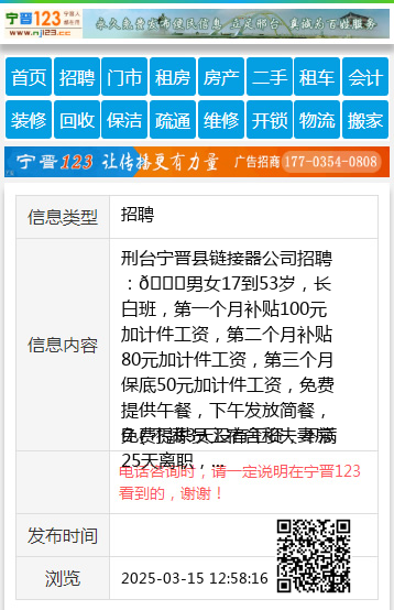 刑台宁晋县链接器公司招聘:💟男女17到53岁,长白班,第一个月补贴100元加计件工资,第二个月补贴80元加计件工资,第三个月保底50元加计件工资,免费提供午餐,下午发放简餐,免费提供员工宿舍和夫妻房