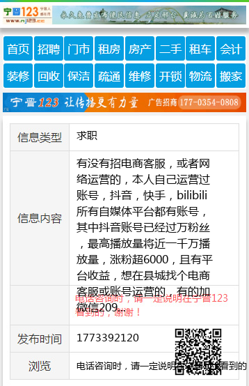 有没有招电商客服,或者网络运营的,本人自己运营过账号,抖音,快手,bilibili所有自媒体平台都有账号,其中抖音账号已经过万粉丝,最高播放量将近一千万播放量,涨粉超6000,且有平台收益,想在县城找个电商客服或账号运营的,有的加微信2094916189。