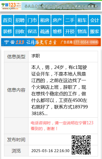 本人,男,24岁,有c1驾驶证会开车,不是本地人我是江西的,之前在这边找了一个火锅店上班,辞职了,现在想找个稳定点的工作,做什么都可以,工资在4500左右就好了,联系方式18979938185 【电话咨询时,请一定说明在宁晋123看到的,谢谢!】 |