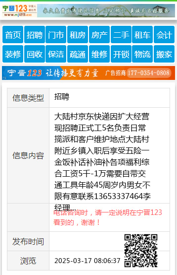 大陆村京东快递因扩大经营现招聘正式工5名负责日常揽派和客户维护地点大陆村附近乡镇入职后享受五险一金饭补话补油补各项福利综合工资5千-1万需要自带交通工具年龄45周岁内男女不限有意联系13653337464李经理 【电话咨询时,请一定说明在宁晋123看到的,谢谢!】 |