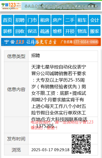 天津七星华控自动化仪表宁晋分公司诚聘销售若干要求:大专及以上学历25-35周岁(有销售经验者优先)男女不限.工资:底薪+提成试用期2个月要求踏实肯干有上进心每天工作八个小时五险节假日全休实行单双休工作地点:方大科技园联系电话:13752055332刘经理.17867425860罗经理 【电话咨询时,请一定说明在宁晋123看到的,谢谢!】 |
