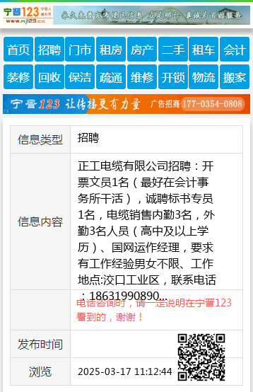 正工电缆有限公司招聘:开票文员1名(最好在会计事务所干活),诚聘标书专员1名,电缆销售内勤3名,外勤3名人员(高中及以上学历)、国网运作经理,要求有工作经验男女不限、工作地点:洨口工业区,联系电话:18631990890 【电话咨询时,请一定说明在宁晋123看到的,谢谢!】 |