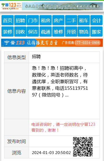 急!急!急!招聘初高中,数理化,英语老师数名,待遇优厚,全职兼职皆可,有意者联系,电话15511975197(微信同号) 【电话咨询时,请一定说明在宁晋123看到的,谢谢!】 |