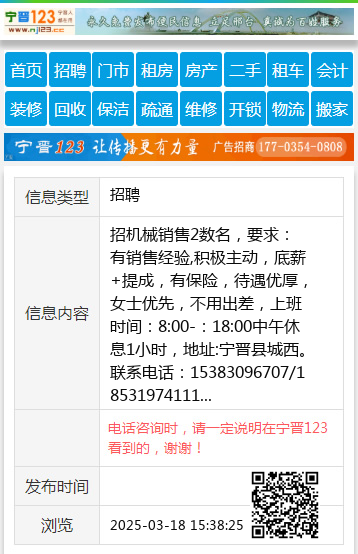 招机械销售2数名,要求:有销售经验,积极主动,底薪+提成,有保险,待遇优厚,女士优先,不用出差,上班时间:8:00-:18:00中午休息1小时,地址:宁晋县城西。联系电话:15383096707/18531974111 【电话咨询时,请一定说明在宁晋123看到的,谢谢!】 |