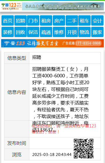 招聘服装整烫工(女),月工资4000-6000,工作简单好学,熟练工每小时工资20块左右,可根据自己时间可延长或减少工作时间,工费高多劳多得,要求干活踏实,有经验者优先,夏天不热,不耽误接送孩子,地址东南汪东口颐和鸿州附近,电话13363760706微信同号 【电话咨询时,请一定说明在宁晋123看到的,谢谢!】 |