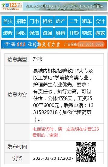 县城内机构招聘教师*大专及以上学历*学前教育类专业,护理养生专业优先。要求:有责任心,执行力高。可包住宿,公休4至8天,工资3500至6000元,联系电话:13315929218(加微信留简历) 【电话咨询时,请一定说明在宁晋123看到的,谢谢!】 |
