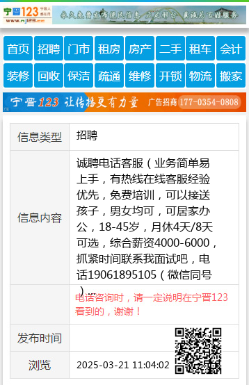 诚聘电话客服(业务简单易上手,有热线在线客服经验优先,免费培训,可以接送孩子,男女均可,可居家办公,18-45岁,月休4天/8天可选,综合薪资4000-6000,抓紧时间联系我面试吧,电话19061895105(微信同号) 【电话咨询时,请一定说明在宁晋123看到的,谢谢!】 |