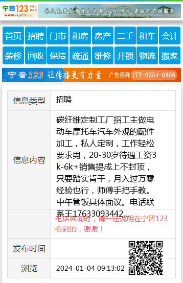 碳纤维定制工厂招工主做电动车摩托车汽车外观的配件加工,私人定制,工作轻松要求男,20-30岁待遇工资3k-6k+销售提成上不封顶,只要踏实肯干,月入过万零经验也行,师傅手把手教。中午管饭具体面议。电话联系王17633093442 【电话咨询时,请一定说明在宁晋123看到的,谢谢!】 |