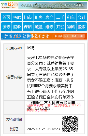 天津七星华控自动化仪表宁晋分公司;诚聘销售若干要求:大专及以上学历25-35周岁(有销售经验者优先)男女不限工资:底薪+提成试用期2个月要求踏实肯干有上进心每天工作八个小时五险节假日全休实行单双休工作地点:方大科技园联系电话:13752055332刘经理17867425860罗经理 【电话咨询时,请一定说明在宁晋123看到的,谢谢!】 |