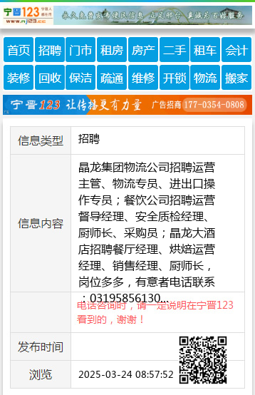 晶龙集团物流公司招聘运营主管、物流专员、进出口操作专员;餐饮公司招聘运营督导经理、安全质检经理、厨师长、采购员;晶龙大酒店招聘餐厅经理、烘焙运营经理、销售经理、厨师长,岗位多多,有意者电话联系:03195856130 【电话咨询时,请一定说明在宁晋123看到的,谢谢!】 |