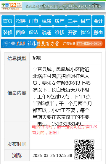 宁晋县城,凤凰城小区附近北塔庄村网店招临时打包人员,要求女年龄30岁以上45岁以下,长白班每天八小时,上午8点到12点,下午1点半到5点半,干一个月两个月都可以,小时工不要,每个星期天要在家带孩子的不要,电话,15203298149 【电话咨询时,请一定说明在宁晋123看到的,谢谢!】 |