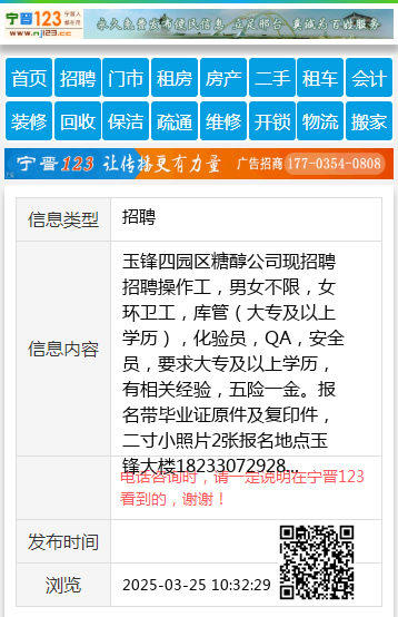玉锋四园区糖醇公司现招聘招聘操作工,男女不限,女环卫工,库管(大专及以上学历),化验员,QA,安全员,要求大专及以上学历,有相关经验,五险一金。报名带毕业证原件及复印件,二寸小照片2张报名地点玉锋大楼18233072928 【电话咨询时,请一定说明在宁晋123看到的,谢谢!】 |