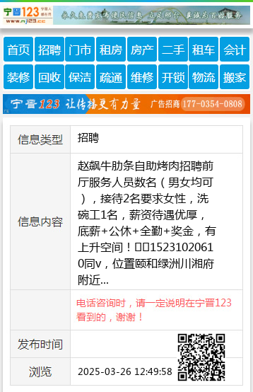 赵飙牛肋条自助烤肉招聘前厅服务人员数名(男女均可),接待2名要求女性,洗碗工1名,薪资待遇优厚,底薪+公休+全勤+奖金,有上升空间!☎️15231020610同v,位置颐和绿洲川湘府附近 【电话咨询时,请一定说明在宁晋123看到的,谢谢!】 |