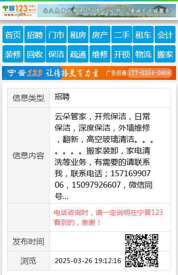 云朵管家,开荒保洁,日常保洁,深度保洁,外墙维修,翻新,高空玻璃清洁。。。。。。。搬家装卸,家电清洗等业务,有需要的请联系我,联系电话;15716990706,15097926607,微信同号 【电话咨询时,请一定说明在宁晋123看到的,谢谢!】 |