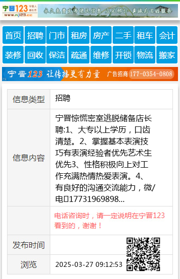 宁晋惊慌密室逃脱储备店长聘:1、大专以上学历,口齿清楚。2、掌握基本表演技巧有表演经验者优先艺术生优先3、性格积极向上对工作充满热情热爱表演。4、有良好的沟通交流能力,微/电17731969898 【电话咨询时,请一定说明在宁晋123看到的,谢谢!】 |