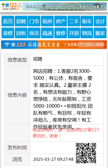 网店招聘:1.客服2名3000-5000,有公休,有宿舍,要求 踏实认真。2.童装主播 2名,有想法有能力,有野心想挣钱,无年龄限制,工资5000-10000++积极阳光 团队有朝气,有目标,年轻有冲劲儿,库房有空调!有工作经验者优先录用。3.美工1名,男女不限。地址:东亚 菜市场 大医院附近 县城,联系电话:15533197597 【电话咨询时,请一定说明在宁晋123看到的,谢谢!】 |