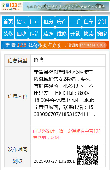 招机械销售女2数名,要求:有销售经验,45岁以下,不用出差,上班时间:8:00-:18:00中午休息1小时,地址:宁晋县城西。联系电话:15383096707/18531974111 【电话咨询时,请一定说明在宁晋123看到的,谢谢!】 |