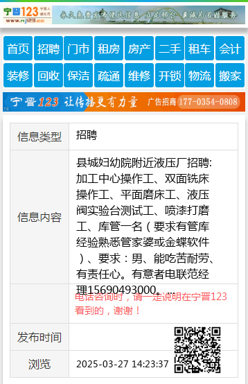 县城妇幼院附近液压厂招聘:加工中心操作工、双面铣床操作工、平面磨床工、液压阀实验台测试工、喷漆打磨工、库管一名(要求有管库经验熟悉管家婆或金蝶软件)、要求:男、能吃苦耐劳、有责任心。有意者电联范经理15690493000。 【电话咨询时,请一定说明在宁晋123看到的,谢谢!】 |