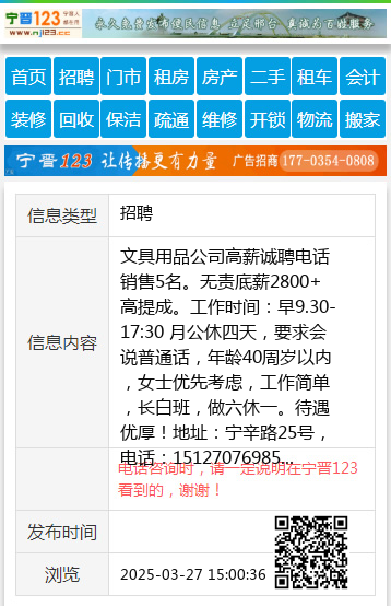文具用品公司高薪诚聘电话销售5名。无责底薪2800+高提成。工作时间:早9.30-17:30 月公休四天,要求会说普通话,年龄40周岁以内,女士优先考虑,工作简单,长白班,做六休一。待遇优厚!地址:宁辛路25号,电话:15127076985 【电话咨询时,请一定说明在宁晋123看到的,谢谢!】 |