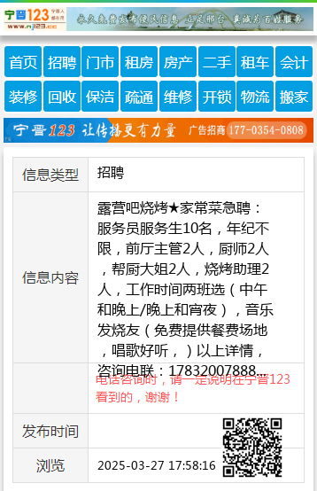 露营吧烧烤★家常菜急聘:服务员服务生10名,年纪不限,前厅主管2人,厨师2人,帮厨大姐2人,烧烤助理2人,工作时间两班选(中午和晚上/晚上和宵夜),音乐发烧友(免费提供餐费场地,唱歌好听,)以上详情,咨询电联:17832007888 【电话咨询时,请一定说明在宁晋123看到的,谢谢!】 |