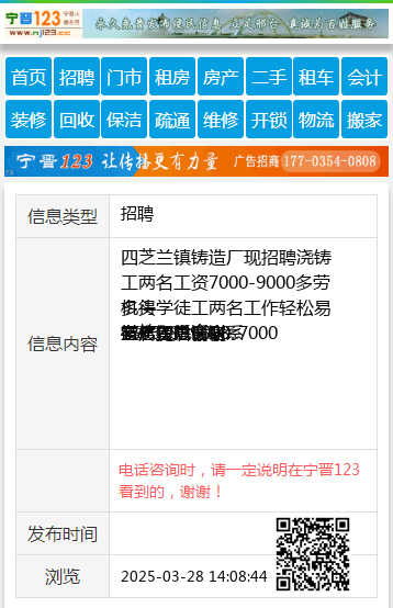 四芝兰镇铸造厂现招聘浇铸工两名工资7000-9000多劳多得