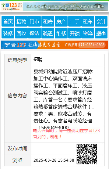 县城妇幼院附近液压厂招聘:加工中心操作工、双面铣床操作工、平面磨床工、液压阀实验台测试工、喷漆打磨工、库管一名(要求管库经验熟悉管家婆或金蝶软件)、要求:男、能吃苦耐劳、有责任心。有意者电联范经理,15690493000。 【电话咨询时,请一定说明在宁晋123看到的,谢谢!】 |