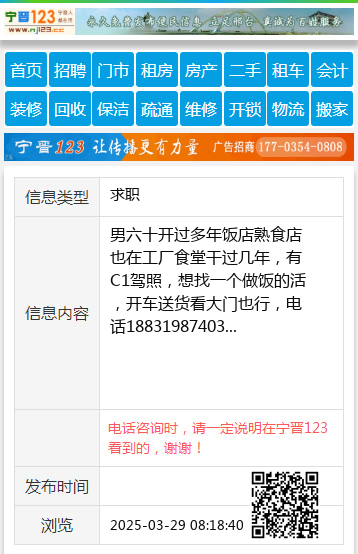男六十开过多年饭店熟食店也在工厂食堂干过几年,有C1驾照,想找一个做饭的活,开车送货看大门也行,电话18831987403 【电话咨询时,请一定说明在宁晋123看到的,谢谢!】 |