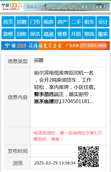 哈尔滨电缆库房招司机一名,会开2吨柴油货车,工作轻松,室内库房,小区住宿。新手勿扰。 要求品行端正,踏实耐劳,无不良嗜好。 联系电话:13704501181