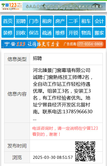 河北臻景门窗幕墙有限公司诚聘:门窗熟练技工师傅2名,全自动工作站工作轻松待遇优厚。组装工3名,安装工3名,有工作经验者优先。地址宁晋县经济开发区北留村南。联系电话:13785966630 【电话咨询时,请一定说明在宁晋123看到的,谢谢!】 |