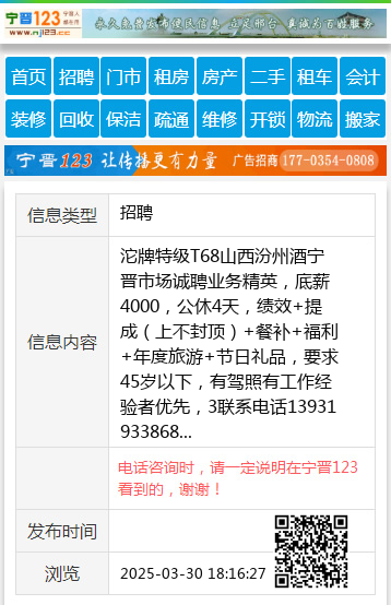 沱牌特级T68山西汾州酒宁晋市场诚聘业务精英,底薪4000,公休4天,绩效+提成(上不封顶)+餐补+福利+年度旅游+节日礼品,要求45岁以下,有驾照有工作经验者优先,3联系电话13931933868 【电话咨询时,请一定说明在宁晋123看到的,谢谢!】 |