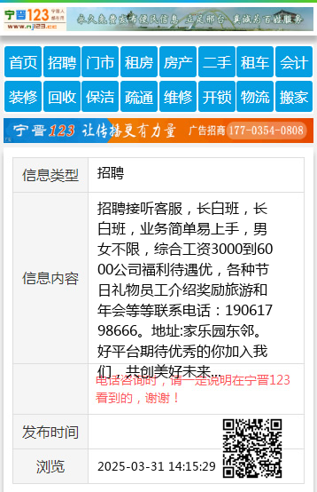 招聘接听客服,长白班,长白班,业务简单易上手,男女不限,综合工资3000到6000公司福利待遇优,各种节日礼物员工介绍奖励旅游和年会等等联系电话:19061798666。地址:家乐园东邻。好平台期待优秀的你加入我们,共创美好未来 【电话咨询时,请一定说明在宁晋123看到的,谢谢!】 |