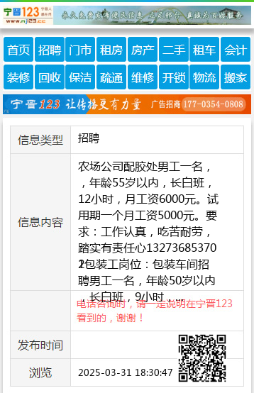 农场公司配胶处男工一名,,年龄55岁以内,长白班,12小时,月工资6000元。试用期一个月工资5000元。要求:工作认真,吃苦耐劳,踏实有责任心132736853701